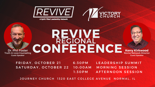 Victory Church is excited to share the upcoming REVIVE REGIONAL CONFERENCE on Friday-Saturday, October 21 & 22 at Journey Church in Normal, IL.