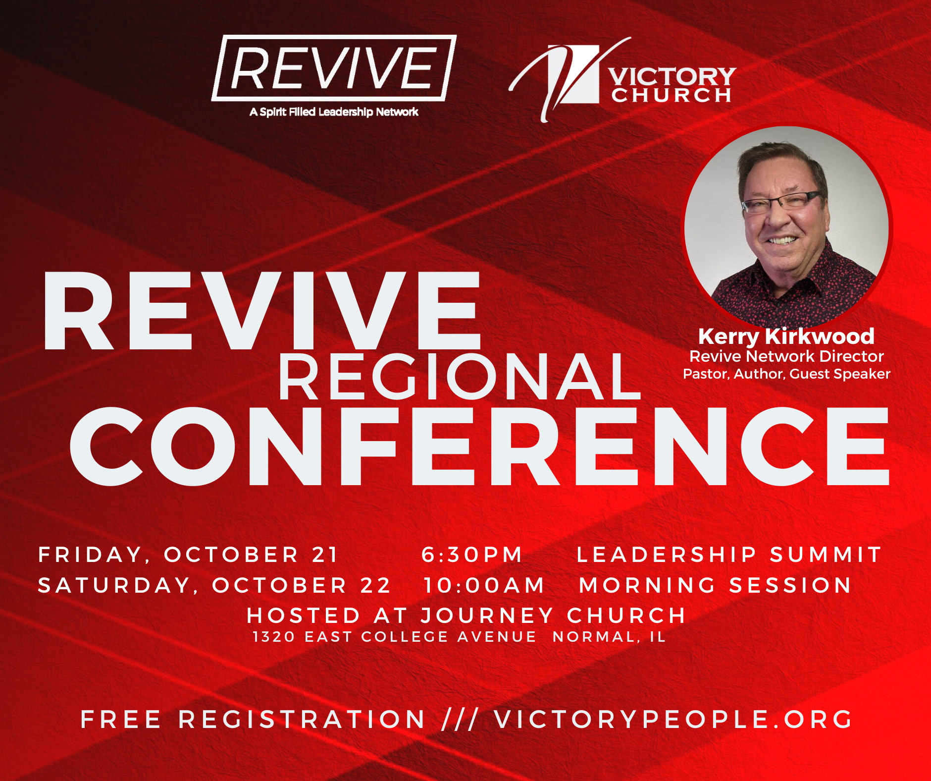 Victory Church is excited to share the upcoming REVIVE REGIONAL CONFERENCE on Friday-Saturday, October 21 & 22 at Journey Church in Normal, IL.